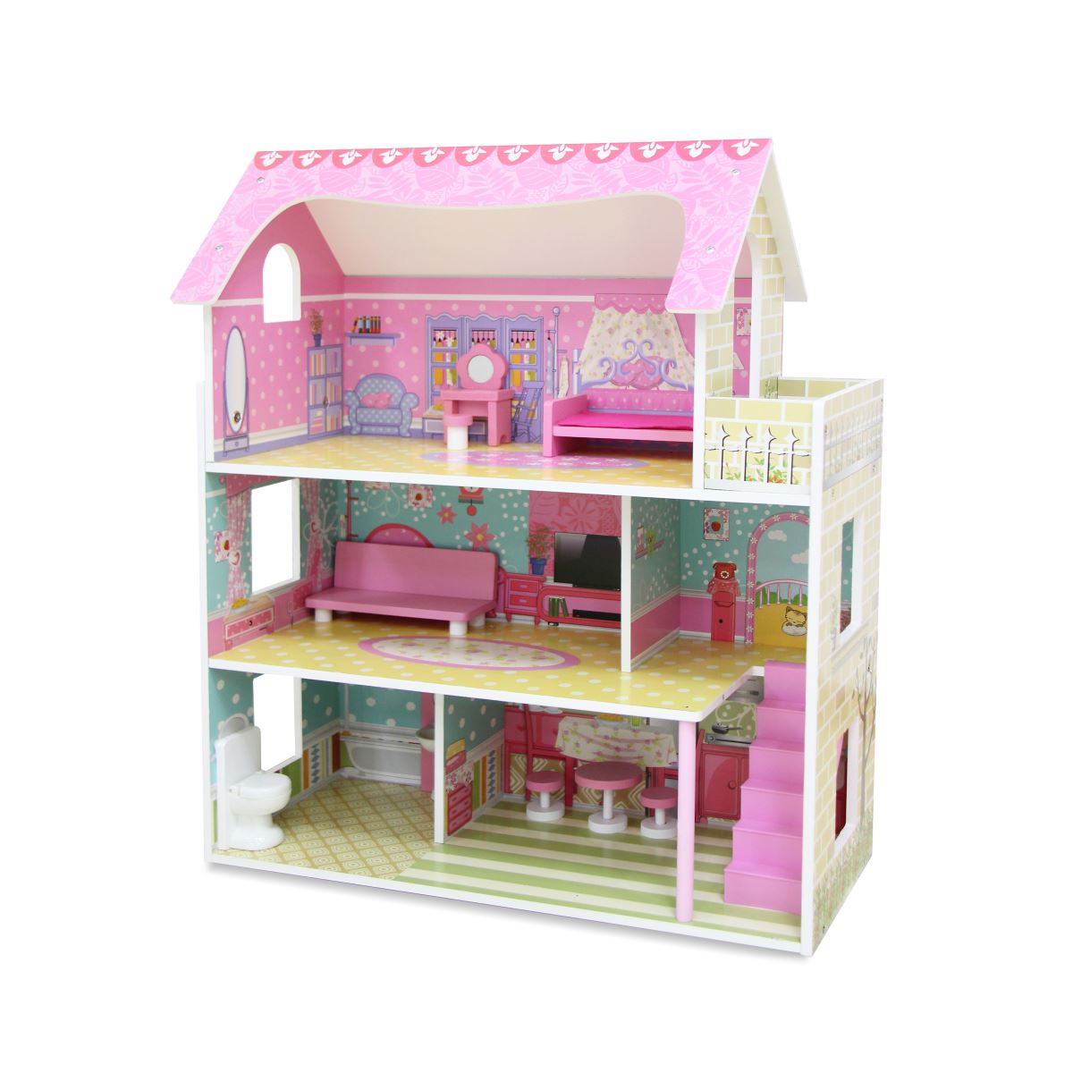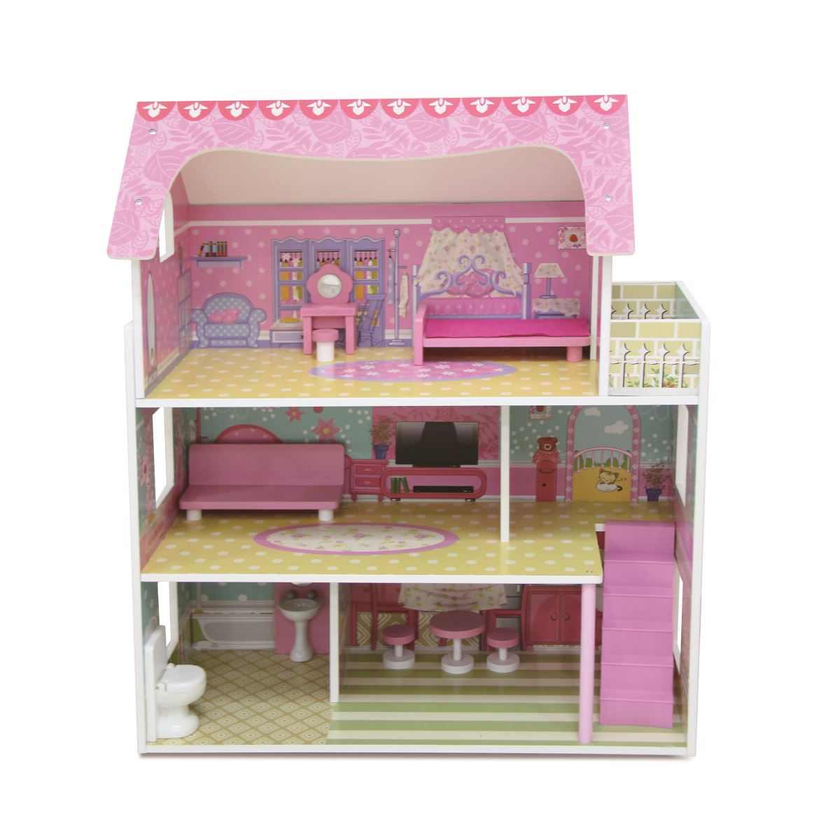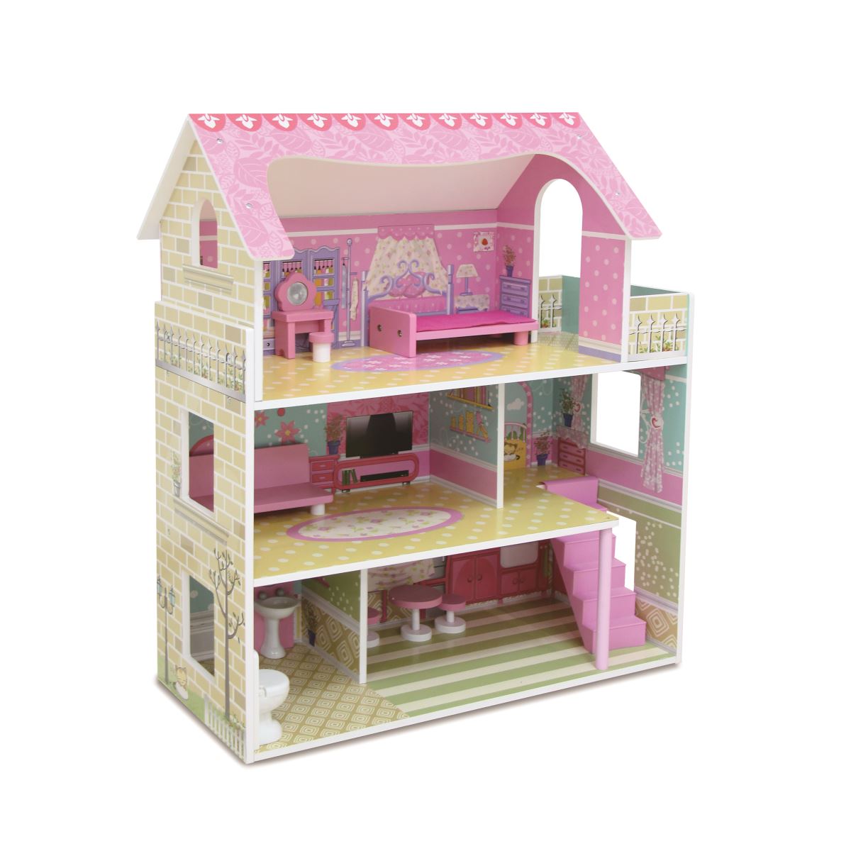 • בית הבובות בגובה 70 ס"מ וכולל 3 קומות ו־5 חדרים מרוהטים, שמזמינים לחקור, לשחק וליצור אינסוף הרפתקאות.