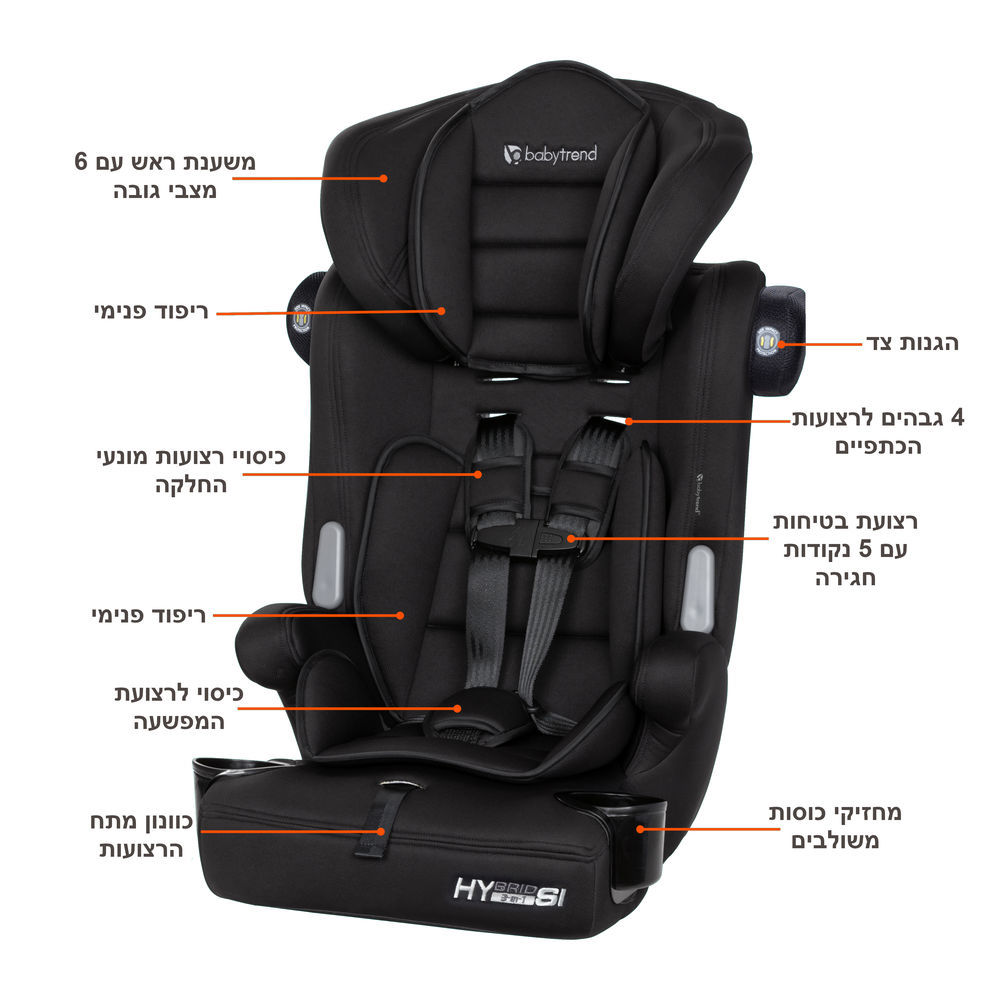 - מושב הבטיחות Baby Trend® Hybrid 3-in-1 Booster Car Seat מספק שילוב אידיאלי של בטיחות, נוחות ושימוש ארוך טווח לילד הגדל.