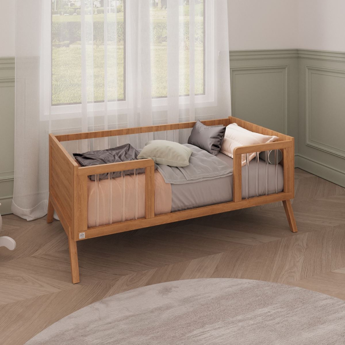 - בליווי חלקי ההסבה המצורפים – ניתן להפוך את מיטת התינוק ל־מיטת מעבר בקלות, ללא צורך ברכישה נוספת.כך מתקבלת מיטה אחת, שימושית לאורך שנים, שמספקת גם עיצוב מיוחד וגם פרקטיות יומיומית.