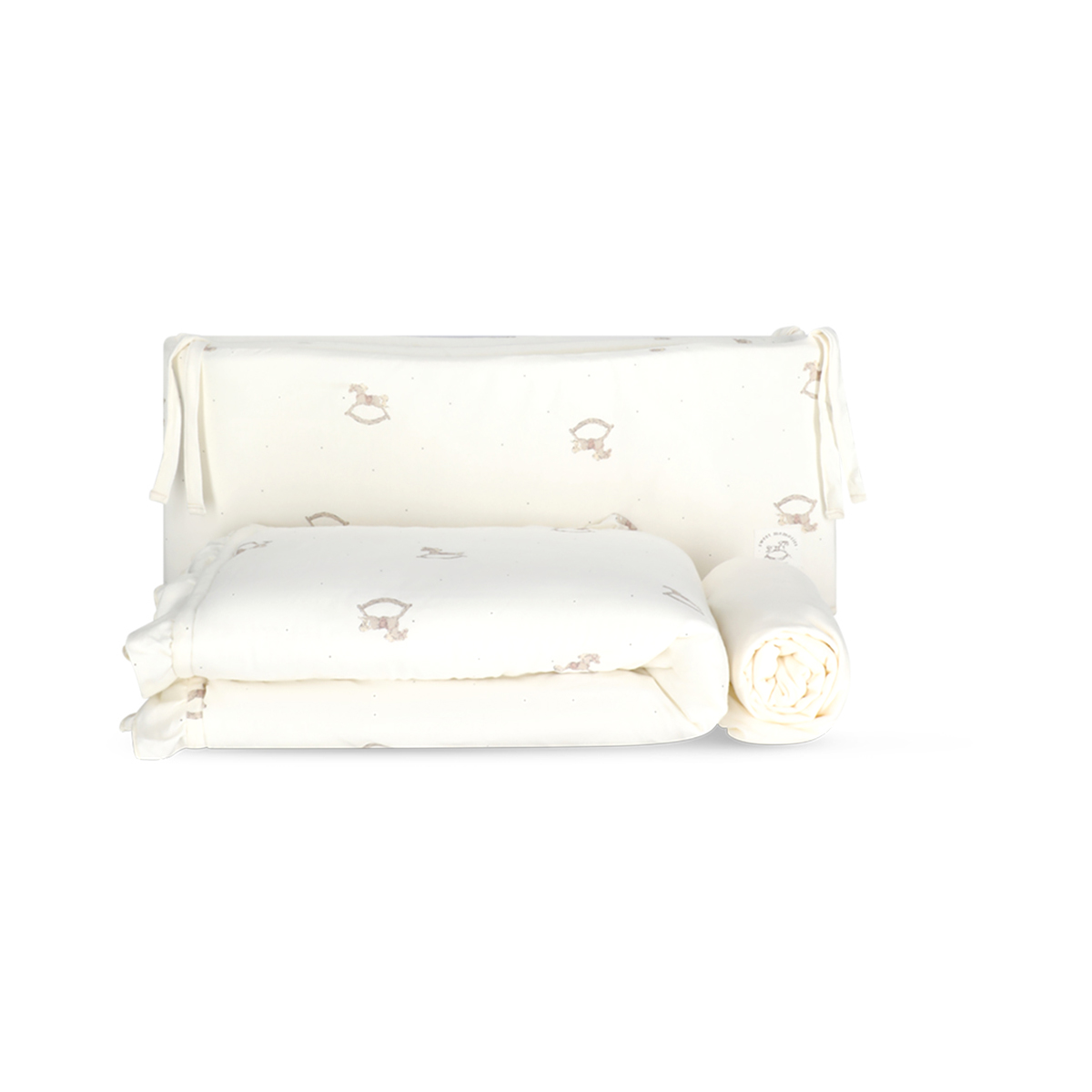 האיורים העדינים, על רקע צבעוניות הרמונית, יוסיפו אוירה רכה ועדינה לחדר של הבייבי. המוצרים עשויים מבד סינגל ג’רזי רך, נעים ומלטף מכותנה איכותית, ומבדי טטרה 100% כותנה רכה ואיכותית. הליין מכיל מגוון של מוצרים לחדר הילדים – כלי מיטה ומוצרים לטיפול בתינוק וכן אביזרים לעגלה. הוראות כביסה בהתאם לתווית.הסט מכיל :