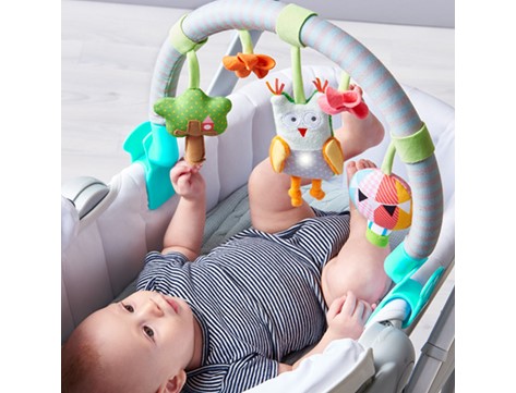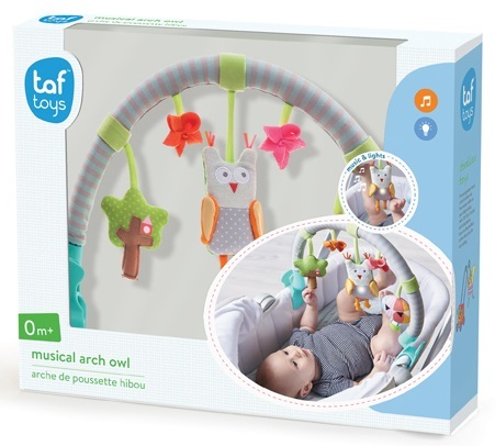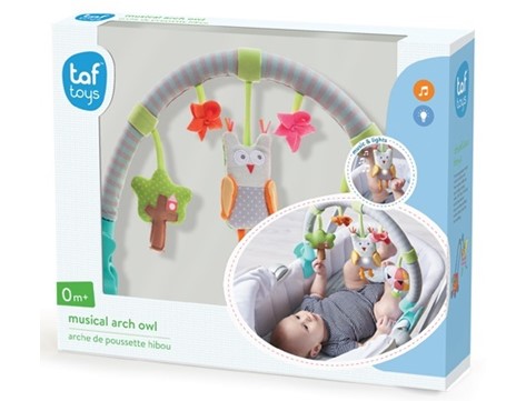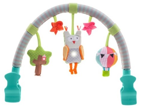 - קשת בד רכה וצבעונית המתאימה לעגלת תינוק או לסלקל עם בובה מוזיקלית ושתי בובות משחק. מוזיקה תישמע ובובת הינשוף תאיר כאשר התינוק ייגע בבובה.