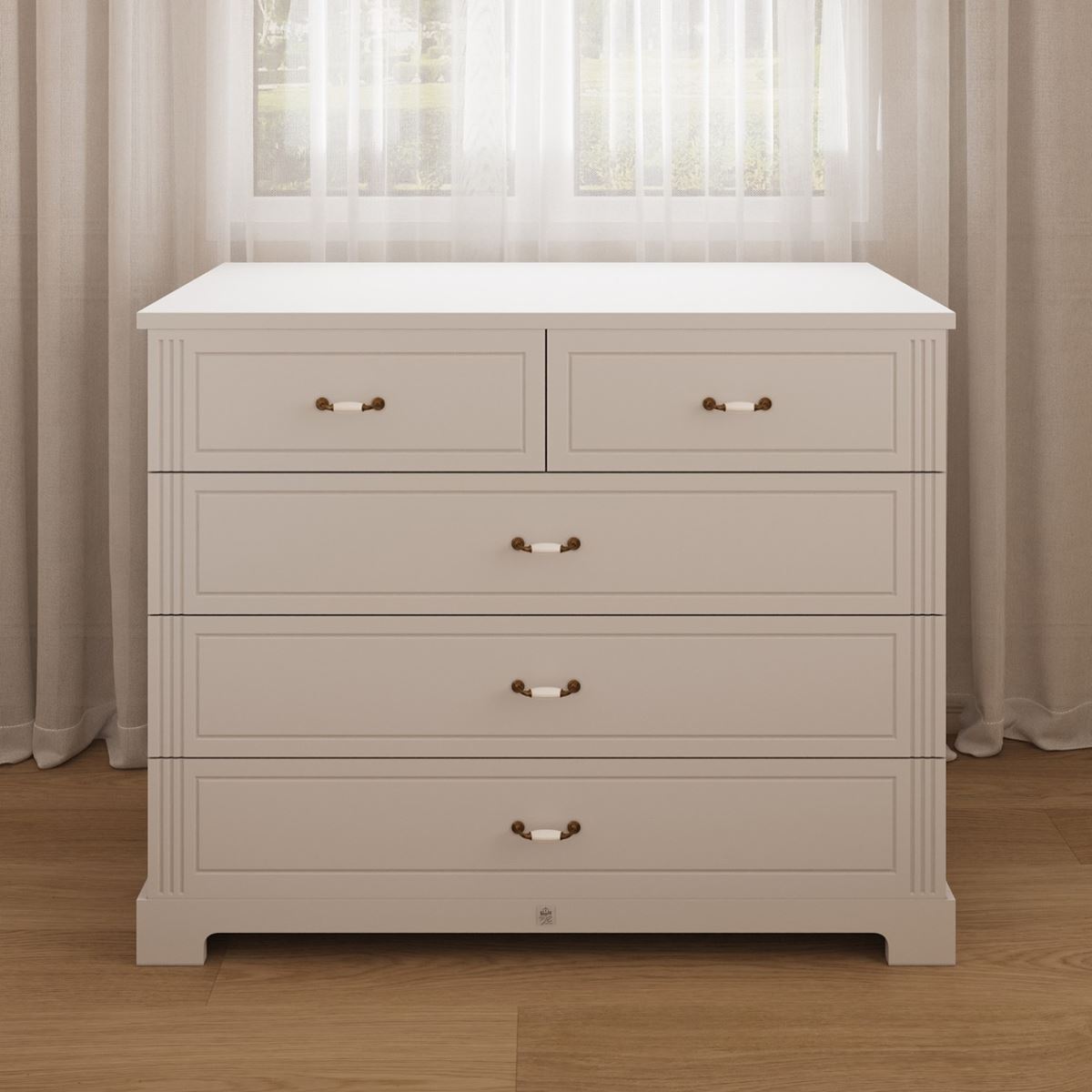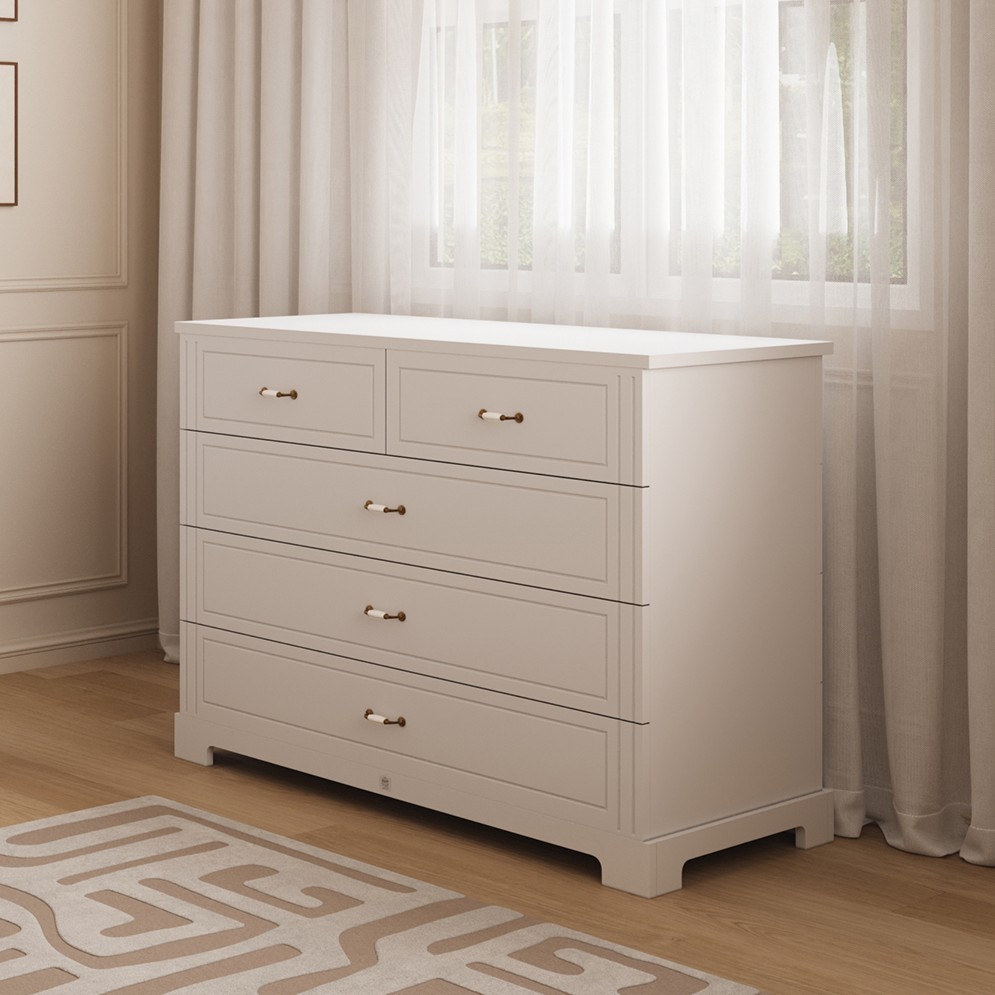 - חלוקה נוחה ופרקטית של 5 מגירות בעומק 55 ס”מ, המאפשרות אחסון נדיב במיוחד לבגדי תינוק, טקסטיל, חיתולים ואביזרים נוספים, תוך שמירה על סדר ונגישות יומיומית.