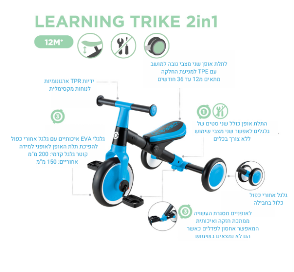 - תלת אופן 2 ב1 המקנה לילדך פיתוח מוטורי וביטחון בשני מצבים שונים.