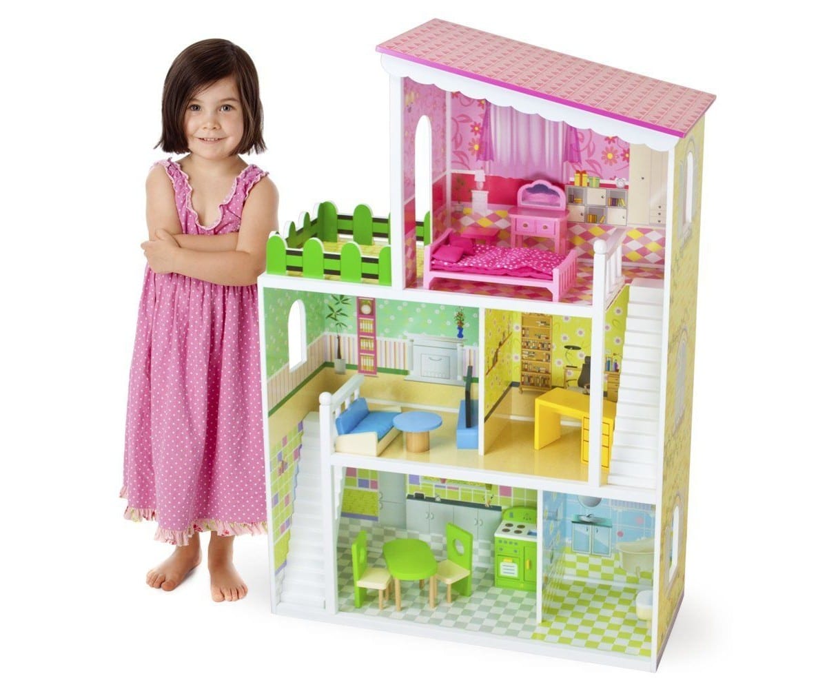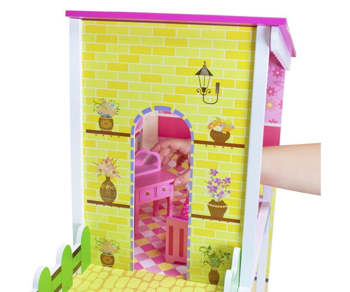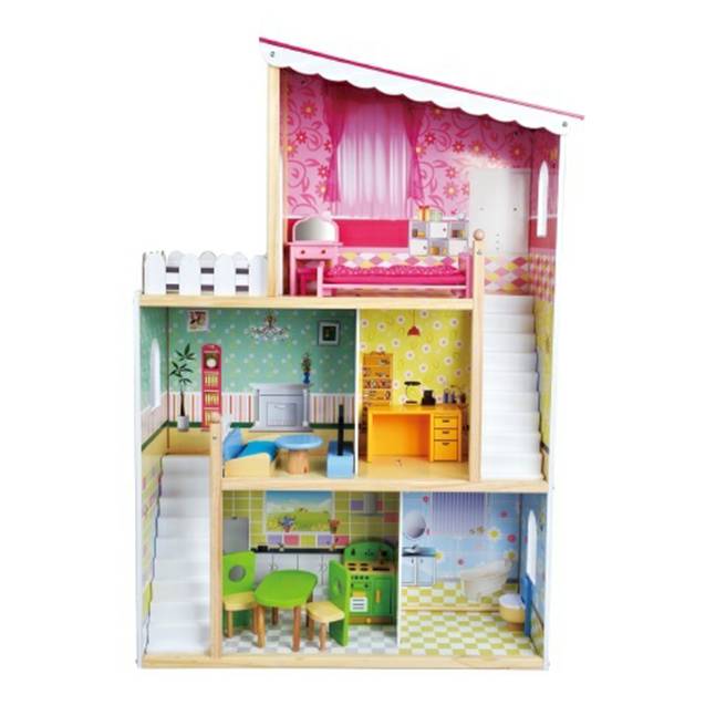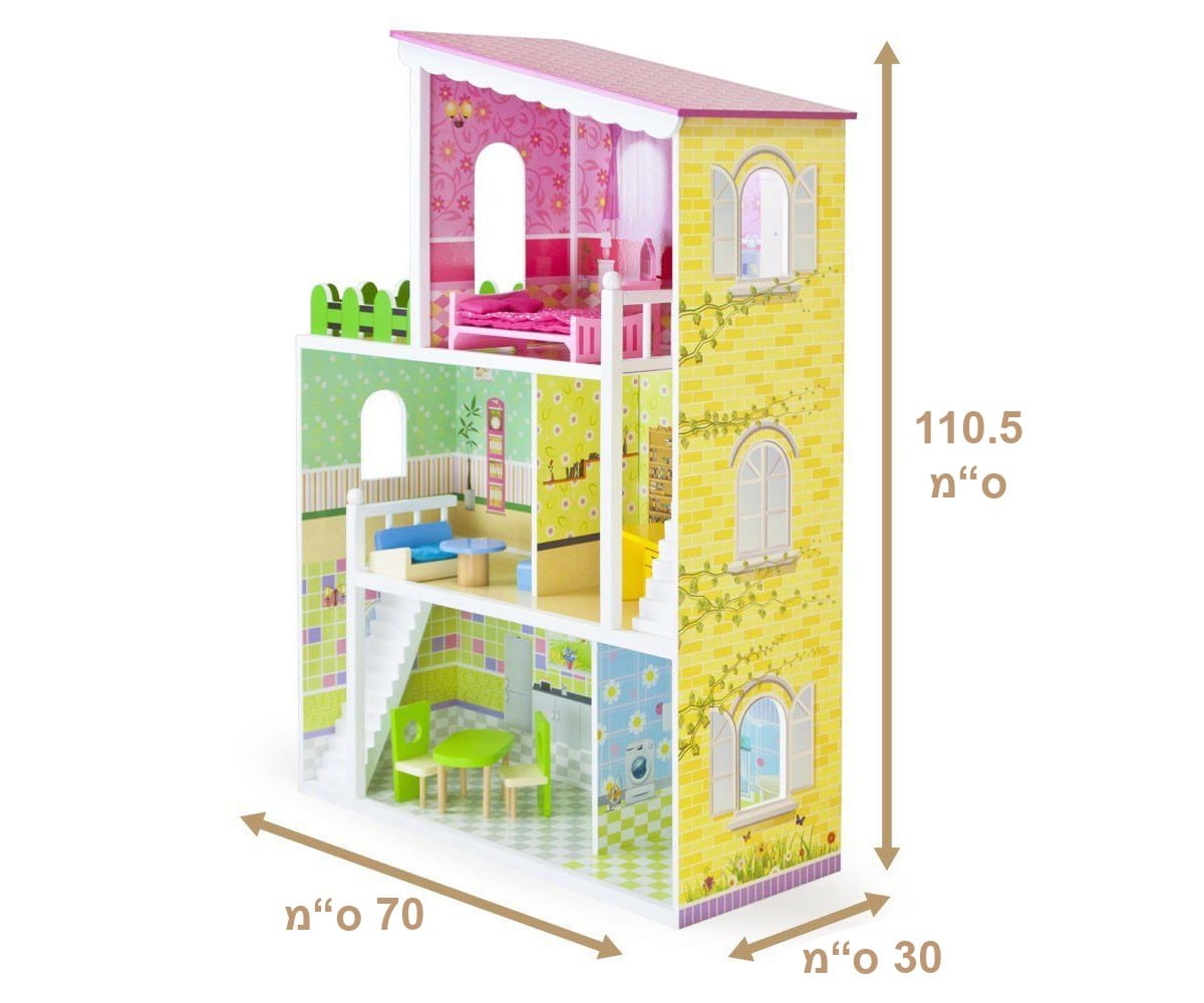 בית בובות תלת קומתי, מעוצב וצבעוני עם מגוון אביזרים וריהוט דגם ענק ומפואר